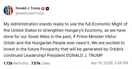 And the timing could not be more chef’s kiss. Hungary is heading into an election where Orbán is, for the first time in years, facing a legitimate threat from a challenger who has been gaining serious momentum. Polling has shown that race tightening or even tilting away from Orbán, and instead of quietly supporting from afar, we’ve got a full American political cameo happening in the middle of it.