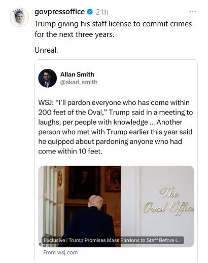 Because we are now fully living inside what I can only describe as the Presidential Splash Zone of Pardons, where instead of laws we just have vibes and a very large imaginary circle drawn around the Oval Office like it’s a middle school dance and anyone inside it is automatically safe from consequences. Not “close advisors.” Not “specific individuals.” No. We’re talking about a radius. A literal proximity-based forgiveness system. As in, if you have ever wandered within a brisk jog of the Oval Office, congrats, you may qualify for a full legal spa day where everything gets rinsed off and sent down the drain like last season’s self-awareness.